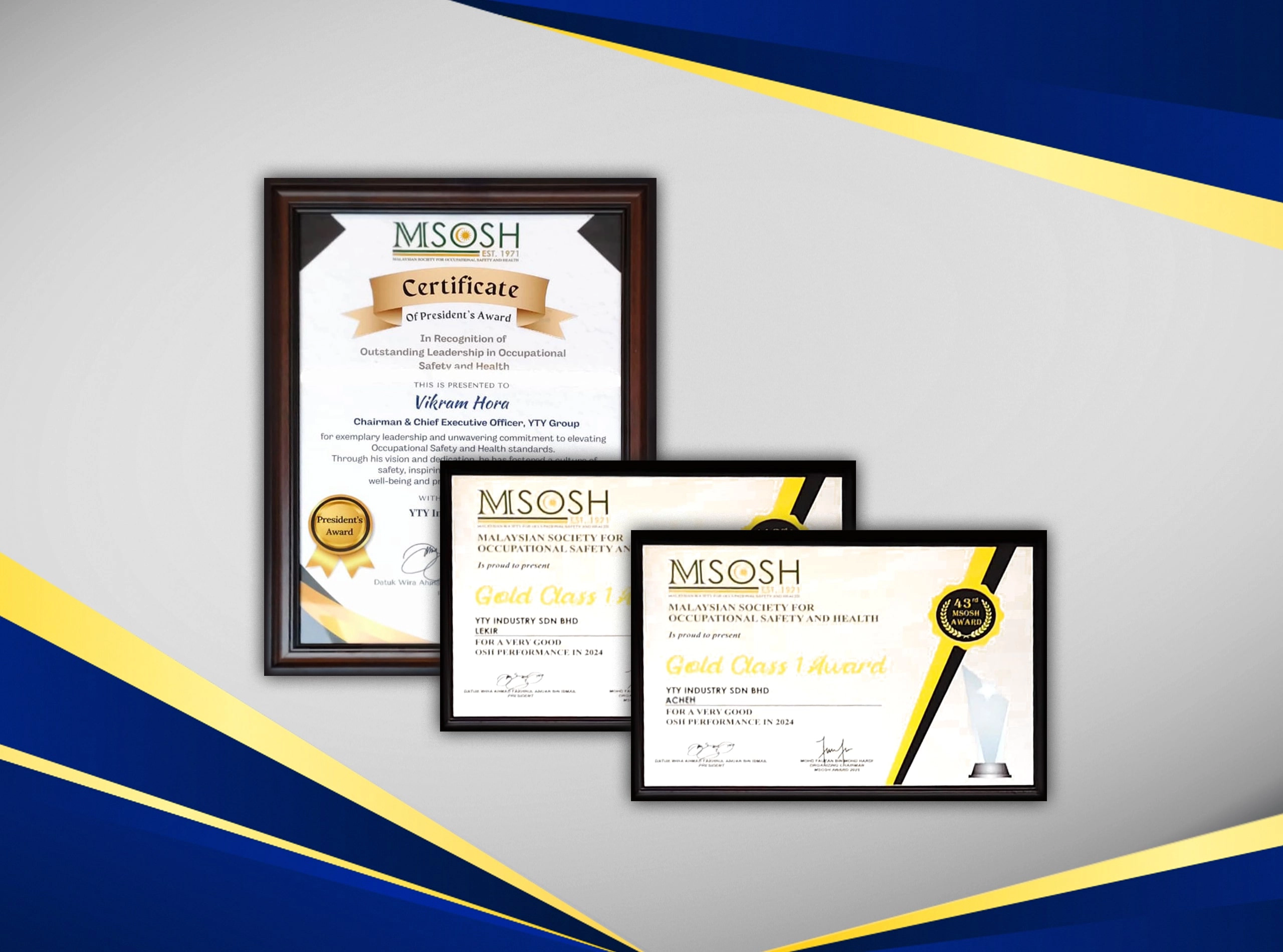 YTY is pleased to announce it has received multiple awards this year for continued workplace safety and occupational excellence by the Malaysian Society for Occupational Safety and Health (MSOSH), the leading professional safety watchdog in Malaysia. YTY was recognized on November 13 at the 43rd MSOSH Awards, held at the Putrajaya International Convention Center, where it earned a Gold Class 1 certification for both its Lekir and Acheh manufacturing facilities.